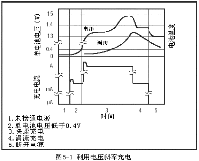 圖5-1反映了利用電壓梯度控制快速充電的全過程。在時(shí)間1內(nèi),MAX712/MAX713從電池吸收很小的電流(5mA左右),當(dāng)接通充電電源后,開始對電池以C/16的速率進(jìn)行涓流充電(因?yàn)殡姵仉妷旱陀?.4V),電池電壓開始上升(時(shí)間2)。當(dāng)單節(jié)電池電壓上升到0.4V以后,快速充電正式開始(時(shí)間3),電池電壓和電池溫度持續(xù)上升,充電電流保持在設(shè)定值不變。當(dāng)電池電量達(dá)到額定值后,電池組電壓開始下降,即dv/dt為零(MAX712)或?yàn)樨?fù)值(MAX713)時(shí)系統(tǒng)從快速充電轉(zhuǎn)到涓流充電(時(shí)間4),此時(shí)電池電壓繼續(xù)下降到一定值后保持不變,電池溫度也隨之降低。當(dāng)充電電源從電路中移開后負(fù)載和MAX712/MAX713從電池吸收電流(時(shí)間5)。為保證電路能準(zhǔn)確、可靠地工作,在選擇直流充電電源DC時(shí),DC必須大于6V且在線性模式下要求DC必須比電池組最大電壓高出至少1.5V(開關(guān)模式2V)。