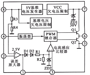 第8腳為5V基準(zhǔn)電壓輸出端,同時(shí)在IC內(nèi)部經(jīng)R3、R4分壓為2.5V,作為誤差檢測基準(zhǔn)電壓。