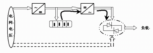 如圖1所示,在電網(wǎng)電壓工作正常時,給負載供電如所示,而且,同時給儲能電池充電;當突發(fā)停電時,UPS電源開始工作,由儲能電池工給負載所需電源,維持正常的生產(chǎn)(如粗黑→所示);當由于生產(chǎn)需要,負載嚴重過載時,由電網(wǎng)電壓經(jīng)整流直接給負載供電(如虛線所示)。