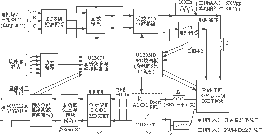 ??? 1)兩種直流輸出電壓和電流大不相同的3500W高檔電源(Vo、Io均相差7倍),其主功率變換電路的三大環(huán)節(jié)基本相同,即電網(wǎng)輸入濾波整流電路;PFC系統(tǒng)的Buck-Boost組合電路亦分段控制;全橋變換器移相式控制ZVS軟開關電路。