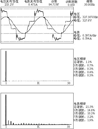 測量打印的電網(wǎng)輸入波形、電流頻譜(省略了電壓頻譜)