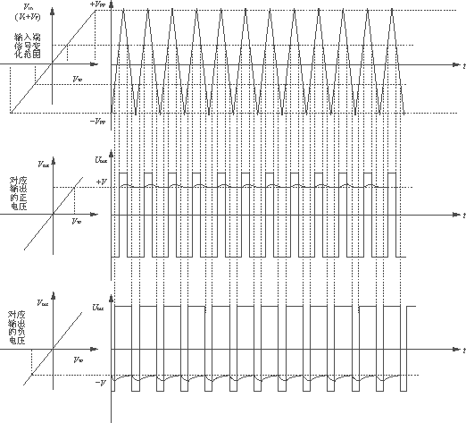 圖2??? 放大器中的三角波、音頻正弦信號產(chǎn)生的PWM波形及其相互關(guān)系