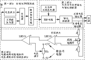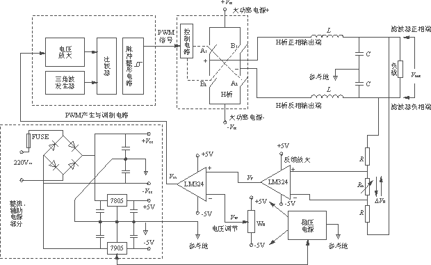 ??? 2)當(dāng)在輸出端接上一個電位器調(diào)節(jié)放大器的輸入信號在一個正負(fù)范圍內(nèi)發(fā)生變化時,放大器的輸出也在給H橋供電的電源的正負(fù)幅值之間發(fā)生著變化,輸入的一個很小的變化就可以在輸出獲得較大的從負(fù)到正的電壓調(diào)整范圍,故實現(xiàn)寬范圍正負(fù)電壓輸出調(diào)節(jié)也是可能的。