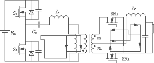 ??? 不對(duì)稱半橋DC/DC變換器如圖1所示。圖中,S1及S2為主開(kāi)關(guān);D1及C1和D2及C2分別為S1及S2的寄生元器件;n1及n2分別為兩個(gè)次級(jí)與初級(jí)的匝數(shù)比;SR1及SR2為次級(jí)同步整流管,其工作方式等效于整流二極管;Lr為變壓器漏感;Lm為勵(lì)磁電感,所有的電壓與電流已在圖中標(biāo)出。