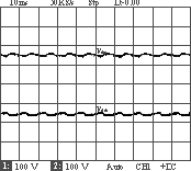 ??? 為了研究滯環(huán)控制方法的特點(diǎn),建立了主電路如圖1的變換器,負(fù)載為2.2kW異步電動(dòng)機(jī),開(kāi)關(guān)管采用IRF840,反并二極管和箝位二極管采用MUR860。圖7為通常SVPWM方法直流側(cè)兩電容電壓的波形;圖8為滯環(huán)控制SVPWM方法的中點(diǎn)電位波形;圖9為滯環(huán)控制SVPWM方法輸出線電壓波形。