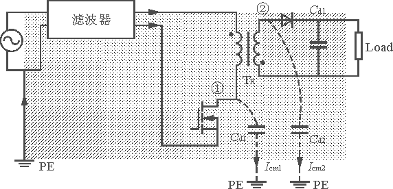 ??? 節(jié)點①及②存在非常大的電壓瞬變,因而在節(jié)點①及②處布線應當占用盡可能小的面積,以減小分布電容值。分布電容一般為pF級,因而在低頻段(<1MHz)其阻抗影響非常顯著,需要濾波器對共模電流進行衰減,共模扼流圈電感值一般取10~100mH。
