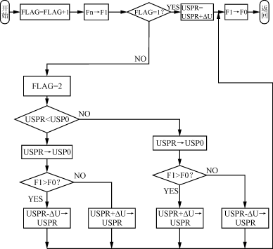 圖6? 系統(tǒng)控制原理框圖 ??? 由圖6可知,本系統(tǒng)結(jié)合太陽電池的功率特性曲線,采用逐步逼近法來實(shí)現(xiàn)太陽電池的最大功率點(diǎn)跟蹤(MPPT),其中MPPT模塊的功能是通過比較前后兩次太陽電池的工作電壓和負(fù)載工作頻率,而輸出一個(gè)逐步趨近最大功率點(diǎn)處的電壓值;同時(shí),為了消除系統(tǒng)振蕩和提高動(dòng)態(tài)響應(yīng)速度,設(shè)計(jì)了PI調(diào)節(jié)結(jié)合軟起動(dòng)的控制方式,通過不斷改變負(fù)載的工作頻率使太陽電池的工作電壓最終等于MPPT的輸出電壓值。圖7和圖8分別為MPPT和PI程序流程圖,軟起動(dòng)程序流程圖略。