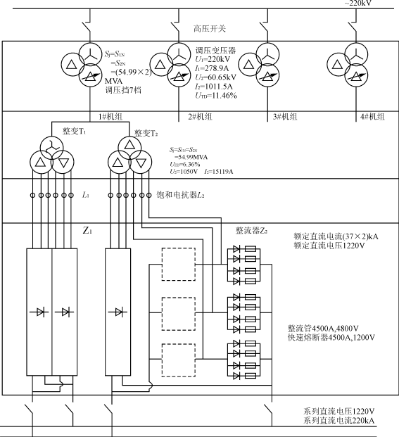 ??? 快速熔斷器在大功率整流器中與整流管或晶閘管串聯(lián)連接,作為對整流器件短路故障的保護(hù)元件。當(dāng)整流器件發(fā)生反向擊穿故障時,快速熔斷器快速分?jǐn)喙收现返亩搪?a href="http://cshb120.cn/tags/電流/" target="_blank">電流,保護(hù)整流器免受故障短路電流的危害。 1? 大功率整流器的特點 ??? 大功率整流器可以電解鋁用整流器為代表,在我國隨著單個電解槽產(chǎn)量的提高,電解鋁的年產(chǎn)量已由100kt增加到140kt,于是槽電壓已由800V提高到1200V,槽電流已由160kA增至280kA,相應(yīng)的整流變壓器容量已提高到75~100MVA。單臺輸出電流高達(dá)50~75kA的整流器,對整流管、快速熔斷器也提出了更高的技術(shù)要求。 ??? 圖1為年產(chǎn)140kt電解鋁用直流系統(tǒng)圖,它由四組整流機(jī)組并聯(lián)組成,其中一組為備用。每組整流變壓器容量2×54.99MVA,向二臺1220V、37kA整流裝置供電。整流器采用三相橋式同相逆并聯(lián)電路,每橋臂由4只ZP-4800V/4500A整流管并聯(lián)組成,下面討論如何選用合適的快速熔斷器進(jìn)行保護(hù)。