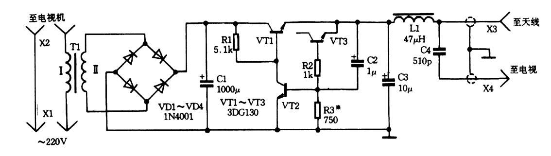 這里推薦的天線放大器電源與眾不同,其特點(diǎn)是不采用傳統(tǒng)的降壓變壓器,也無(wú)需開(kāi)關(guān),可與電視機(jī)同時(shí)接通工作。 電路如圖所示。電流變換器T1的初級(jí)繞組直接串接在電視機(jī)電源回路中,在其上約有2~ 3V的壓降