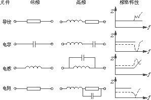 ??? 如圖4所示,在高頻工作下的元件都有高頻寄生特性[2],對(duì)其工作狀態(tài)產(chǎn)生影響。高頻工作時(shí)導(dǎo)線變成了發(fā)射線、電容變成了電感、電感變成了電容、電阻變成了共振電路。觀察圖4中的頻率特性曲線可以發(fā)現(xiàn),當(dāng)頻率過(guò)高時(shí)各元件的頻率特性產(chǎn)生了相當(dāng)大的變化。為了保證開(kāi)關(guān)電源在高頻工作時(shí)的穩(wěn)定性,設(shè)計(jì)開(kāi)關(guān)電源時(shí)要充分考慮元件在高頻工作時(shí)的特性,選擇使用高頻特性比較好的元件。另外,在高頻時(shí),導(dǎo)線寄生電感的感抗顯著增加,由于電感的不可控性,最終使其變成一根發(fā)射線。也就成為了開(kāi)關(guān)電源中的輻射干擾源。