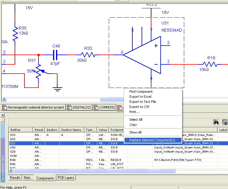 With parts placed and connections created, even a simple design begins to evolve into a schematic of size and complexity. Devices and wires span a sheet, making the search for specific elements somewhat difficult. This is an issue since the nature of the development process is to be in a state of constant change, with elements being moved and edited while a design is improved. The ability to easily manage and access these elements across a vast schematic is extraordinarily important. For a design of any scope, the Multisim spreadsheet view (Figure 4) is a detailed tabular listing of all nets and components that can be sorted by reference designator, schematic sheet and other properties. The engineer benefits from an organized, single interface in which to view and edit the properties of the listed design elements. This spreadsheet view gathers the functionality that can normally only be accessed by selecting the part itself on the schematic. This offers immediate and comprehensive access to all elements of a circuit. From this spreadsheet view, a footprint can be changed, a part replaced and a net renamed, eliminating the trying task of searching across multiple pages and numerous blocks to accomplish the same result.
