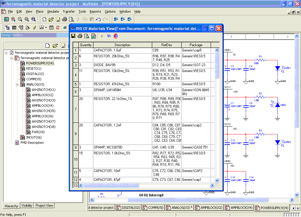 When using hierarchical blocks for modular design, the next requirement of the capture tool is to centrally manage all stages of the design, from schematics to datasheets, to proposal and design documents. This entails a project-based approach, and is advantageous to both to small simple designs and more complex and broad-reaching circuits. In the Multisim environment a project can be defined. Through this project all schematics, layout files and documents can be linked together. This organization creates a single project that binds the separate parts of a design into one entity, simplifying the management of all parts of the design process, particularly in team development. When?collaboration extends among cubicles or continents, Multisim provides an organized way to effectively bring a design together.