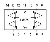 LM324是四運(yùn)放集成電路,它采用14腳雙列直插塑料封裝,外形如圖所示。它的內(nèi)部包含四組形式完全相同的運(yùn)算放大器, 除電源共用外,四組運(yùn)放相互獨(dú)立。每一組運(yùn)算放大器可用圖1所示的符號(hào)來表示,它有5個(gè)引出腳,其中“+”、“-”為兩個(gè)信號(hào)輸入端,“V+”、“V-”為正、負(fù)電源端,“Vo”為輸出端。兩個(gè)信號(hào)輸入端中,Vi-(-)為反相輸入端,表示運(yùn)放輸出端Vo的信號(hào)與該輸入端的位相反;Vi+(+)為同相輸入端,表示運(yùn)放輸出端Vo的信號(hào)與該輸入端的相位相同。LM324的 引腳排列見圖2