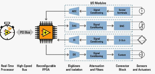 CompactRIO上的FPGA與外界通過C系列I/O模塊連接,C系列I/O模塊由某些隔離模塊、數(shù)模轉(zhuǎn)換器(DAC)或模數(shù)轉(zhuǎn)換器(ADC)組成,還含有專用接頭盒。I/O的功能取決于特定的設(shè)計和控制要求。