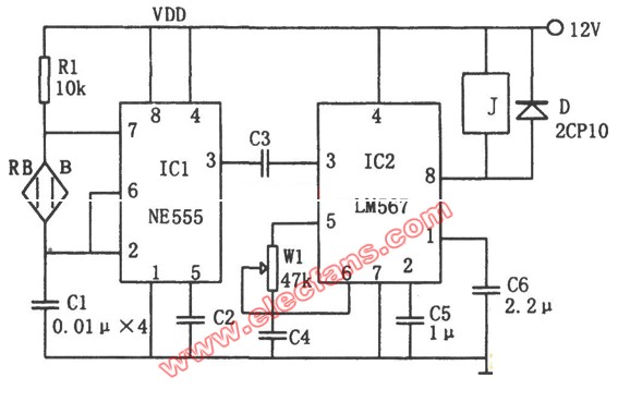 此采用溫度/頻率轉(zhuǎn)換的高精度溫控電路圖由溫度傳感器B、多諧振蕩器、音頻譯碼器和繼電器等組成。多諧振蕩器由IC1(555)和R1、C1、溫度傳感器8組成,其振蕩頻率為fc=1.44/(Rl+2RB)C1。由于RB隨溫度變化,因此fc也隨溫度的變化而改變。音頻譯碼器采用具有鎖相環(huán)的單音頻譯碼集成電路IC2(LM567),其中心頻率為fo=1/1.1Rw1C4,調(diào)節(jié)W1,使fo為設定溫度的頻率。當IC1的振蕩頻率fc與IC2的中心頻率fo一致時,LM567輸出低電平(⑧腳),使繼電器J吸合,將負載接通。