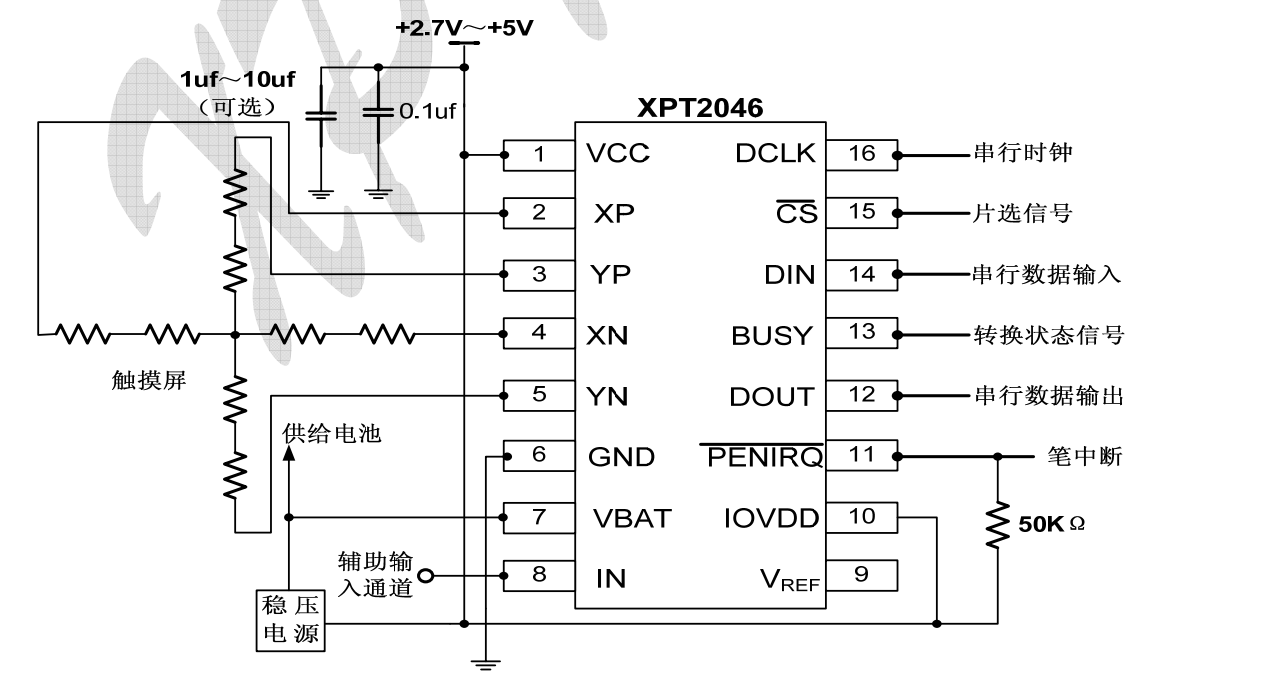 XPT2046是一顆12位的ADC芯片,可以當(dāng)做普通的ADC芯片使用,但是一般都是用在電阻觸摸屏上,方便定位觸摸屏坐標(biāo)。