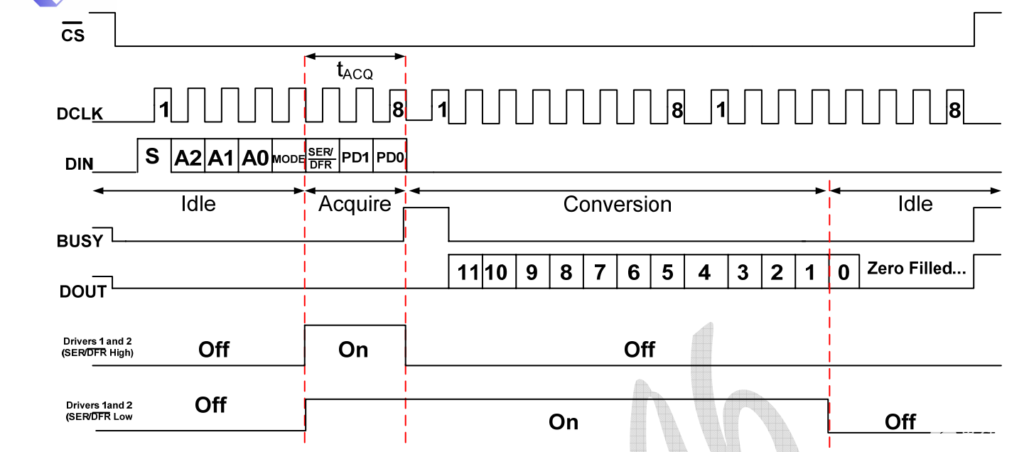 前 8 個時鐘用來通過DIN引腳輸入控制字節(jié)。當(dāng)轉(zhuǎn)換器獲取有關(guān)下一次轉(zhuǎn)換的足夠信息后,接著根據(jù)獲得的信息設(shè)置輸入多路選擇器和參考源輸入,并進入采樣模式,如果需要,將啟動觸摸面板驅(qū)動器。 3 個多時鐘周期后,控制字節(jié)設(shè)置完成,轉(zhuǎn)換器進入轉(zhuǎn)換狀態(tài)。這時,輸入采樣-保持器進入保持狀態(tài),觸摸面板驅(qū)動器停止工作(單端工作模式)。