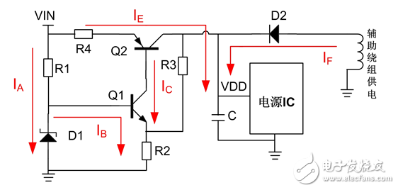 輸入電壓VIN為NPN三極管Q1提供IB電流使用它處于放大區(qū),IC為放大電流也為PNP三極管Q2的基極,通過對IC電流的控制,可使Q2處于飽和狀態(tài)并以IE的飽和電流向電容C充電,直到 Q2處于半截止或半飽和狀態(tài)。此時,電容就等效成一個恒流源為IC芯片提供能量,當電容電壓降到一定值時,啟動電路繼續(xù)為電容充電,直到輔助供電有電壓后,才通過電阻R2、R3之間的分壓使Q1處于截止狀態(tài),此時啟動電路才停止工作,之后芯片的供電完全由輔助繞組提供。