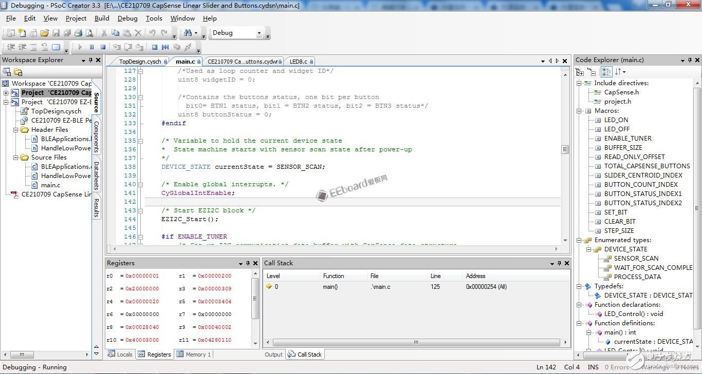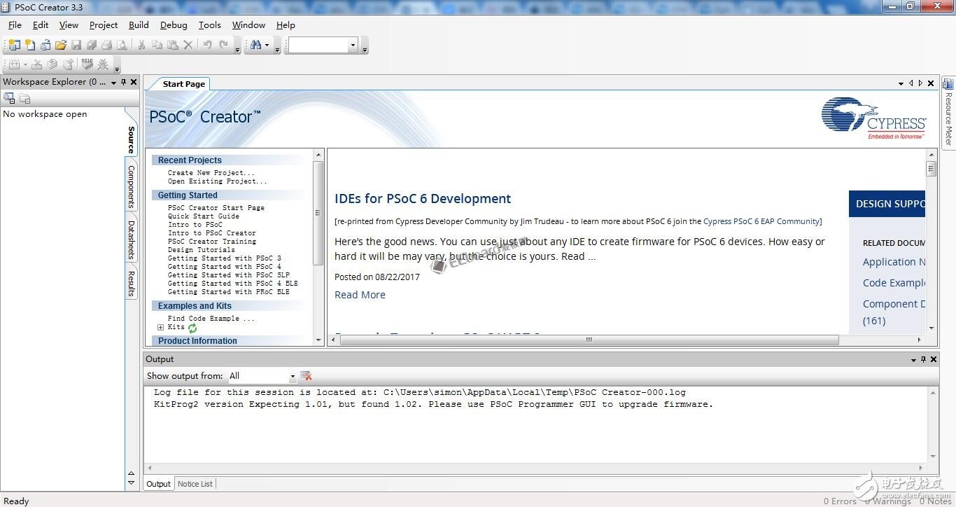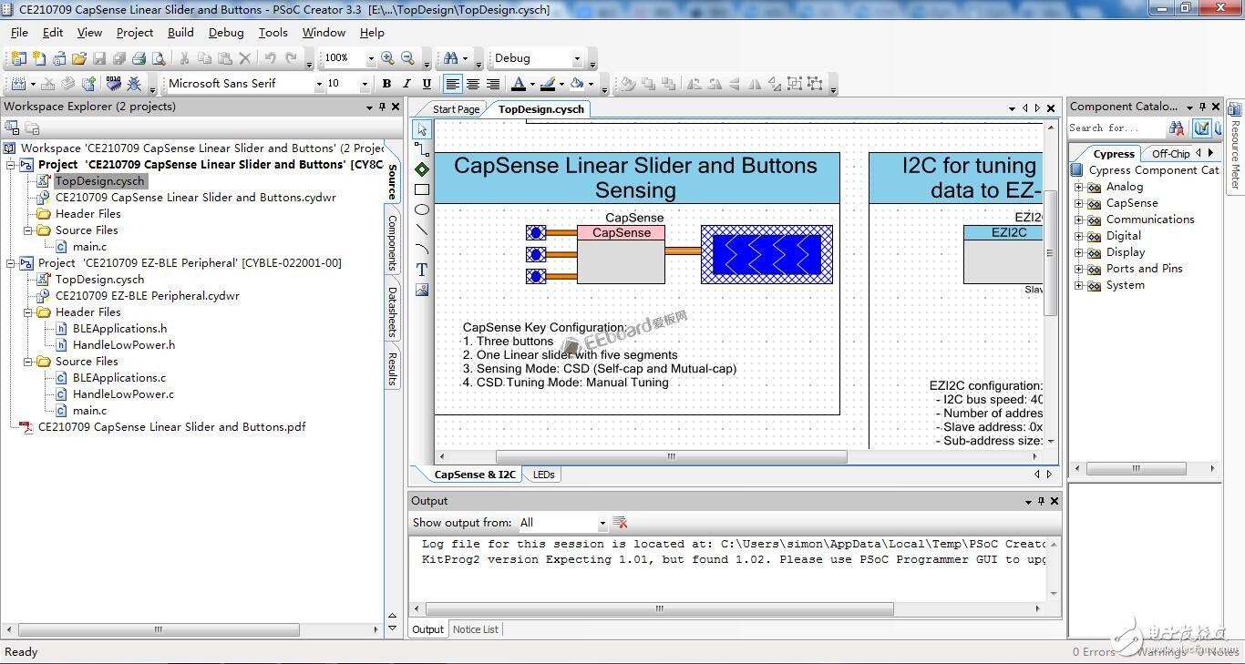 愛板網(wǎng)工程師安裝的IDE版本為3.3,目前最新的版本好像已經(jīng)到4.1了。在賽普拉斯官網(wǎng)可以找到相應(yīng)的開發(fā)demo,這邊就直接拿來使用了。