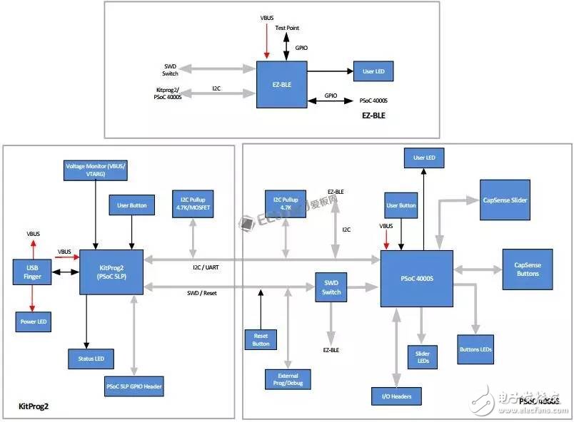 一個(gè)用戶按鍵,一個(gè)PSoC 4000S以及EZ-BLE模塊復(fù)位按鍵、一個(gè)KitProg2按鍵