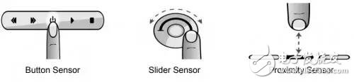 其中電容性板又可以分為兩部分:一塊是三個(gè)電容性按鍵, 另一塊是采用五段電容性滑塊。
