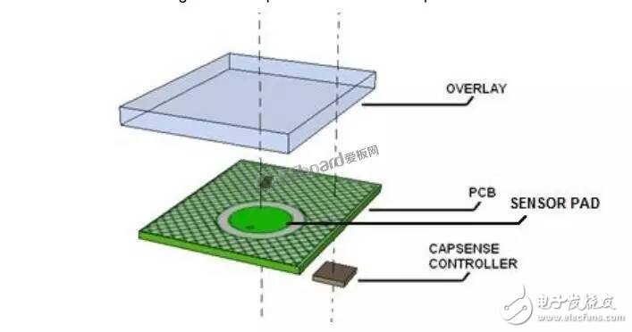 CapSense 觸摸感應(yīng)解決方案的硬件設(shè)計(jì)主要包括觸摸傳感器,PCB,保護(hù)組件(overlay),如下圖的結(jié)構(gòu)所示。
