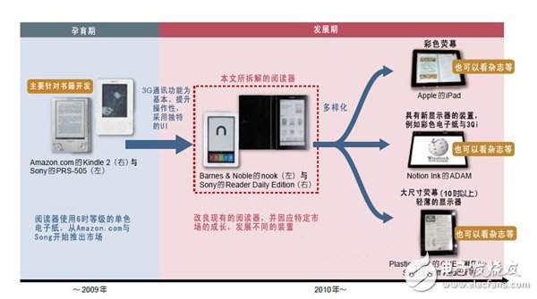 電子書市場(chǎng)正在由蘊(yùn)育期走向發(fā)展期(圖1)。由美國(guó)Amazon.com與日本Sony推動(dòng)建立的這個(gè)市場(chǎng),已有許多新的公司進(jìn)入,使用多種終端提供各種服務(wù)。特別值得關(guān)注的,是除迄今為止