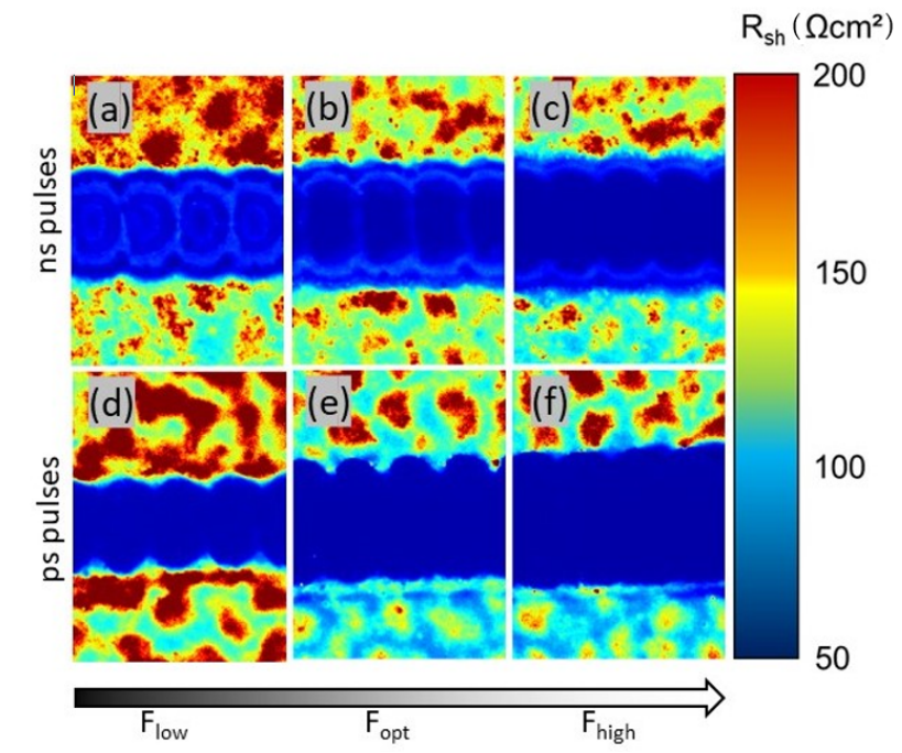 通過PL圖像推導的局部旁路電阻顯示,劃線邊緣存在島狀高阻區(qū)域,可能與溴化物和碘化物相分離導致的材料退化有關(guān)。ns和ps激光在Rsh方面無顯著差異。