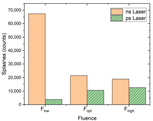 ns和ps激光脈沖刻蝕時,沿激光刻蝕線觀察到的飛濺物數(shù)量隨施加注量的變化對比。溝槽附近分析區(qū)域的寬度與對應溝槽的寬度一致