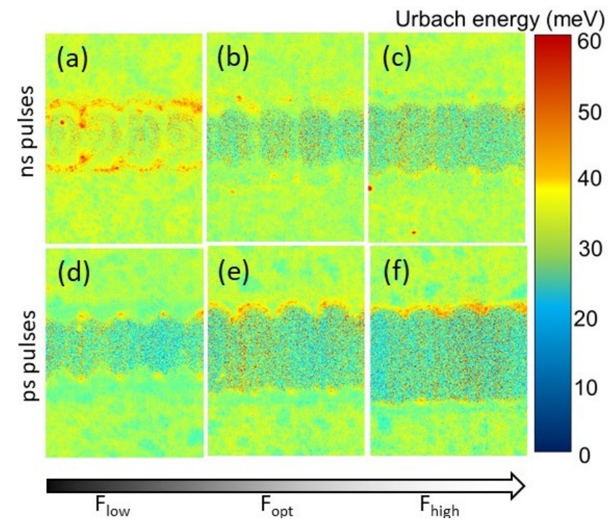 鈣鈦礦樣品局部烏爾巴赫能量的空間分辨圖像:(a–c) 為ns激光脈沖刻蝕樣品,(d–f) 為ps激光脈沖刻蝕樣品