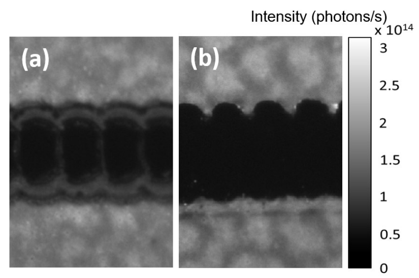 鈣鈦礦樣品的光致發(fā)光通量(光子 / 秒)圖像:(a) 采用ns激光脈沖刻蝕,最優(yōu)注量為 1.36 J/cm2;(b) 采用ps激光脈沖刻蝕,最優(yōu)注量為 2.31 J/cm2