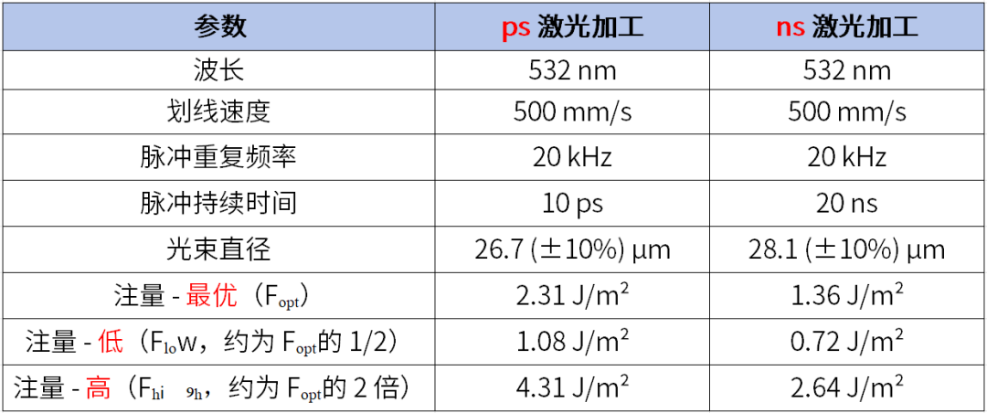激光加工系統(tǒng)配備ps和ns激光源。P1和P2參數(shù)保持不變,P3步驟采用三種注量條件(低、最優(yōu)、高)。劃線過程中樣品在氮氣環(huán)境中處理以減少降解和碎屑。
