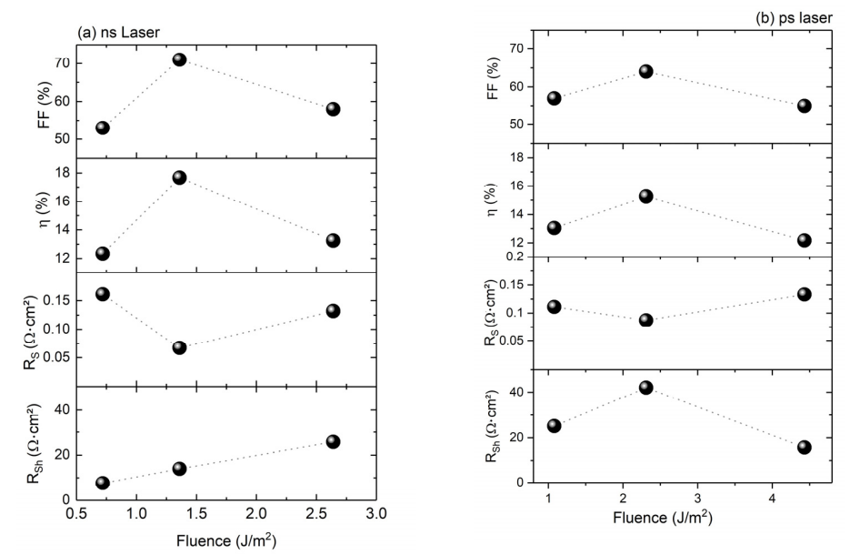 J-V曲線表明,在不同注量條件下均可實現(xiàn)有效的串聯(lián)互聯(lián)。低注量下性能下降因材料去除不足,高注量下因過熱和過度燒蝕。最優(yōu)注量下,尤其是ns激光,性能最佳。