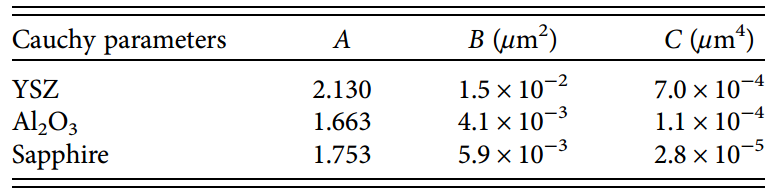 不同材料的介電函數(shù)(DF)預先通過光譜橢偏儀測定,測試樣品為與多層結構厚度相當、沉積參數(shù)一致的單層薄膜,采用柯西模型(n = A + B/λ2 + C/λ?)描述了YSZ、Al?O?和藍寶石在透明光譜范圍內的介電函數(shù)。