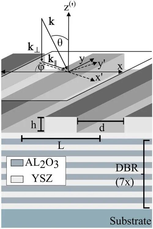 多層結構:采用脈沖激光沉積(PLD)技術在藍寶石襯底上生長。結構包含一個150 nm厚的釔穩(wěn)定氧化鋯(YSZ)頂層和一個由7對Al?O?(90 nm)/YSZ(72 nm)組成的DBR,該設計用于支持BSW。