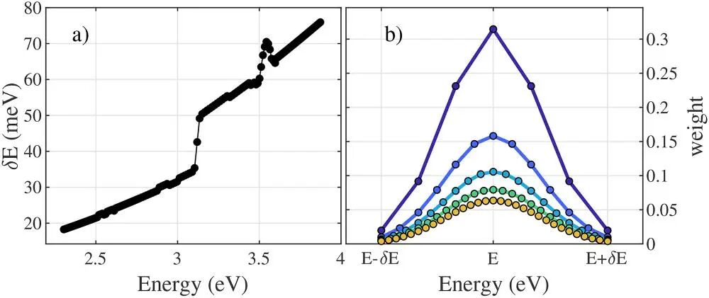 研究的關鍵創(chuàng)新點在于將橢偏儀的有限光譜帶寬(δE)納入模型。通過在與每個測量能量點E?對應的[E? - δE/2, E? + δE/2]區(qū)間內進行高斯加權卷積(使用nw=25個點),有效模擬了帶寬對測量光譜的展寬效應,這對于準確復現(xiàn)窄帶光學響應特征至關重要。