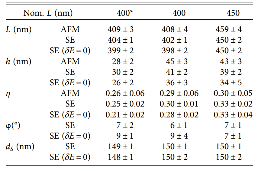 結果表明,成功制備了均勻性良好的光柵,截面接近矩形(側壁略有傾斜),表面脊和溝槽光滑;除L=400 nm、h=40 nm 光柵的第一個溝槽(歸因于掩?;蚬鈻胖械囊旱危┩?,其余參數(shù)的絕對中值偏差均小于5%;需注意,脊邊緣的尖銳特征可能是測量偽影(反向掃描時脊的另一側會出現(xiàn)相同特征)。提取的幾何參數(shù)作為與橢偏分析對比的基準。