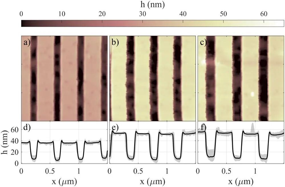 不同光柵的原子力顯微鏡形貌圖:(a)標稱周期 L = 400 nm,高度 h = 30 nm;(b)L = 400 nm, h = 40 nm;(c)L = 450 nm, h = 40 nm。比例尺為 400 nm
