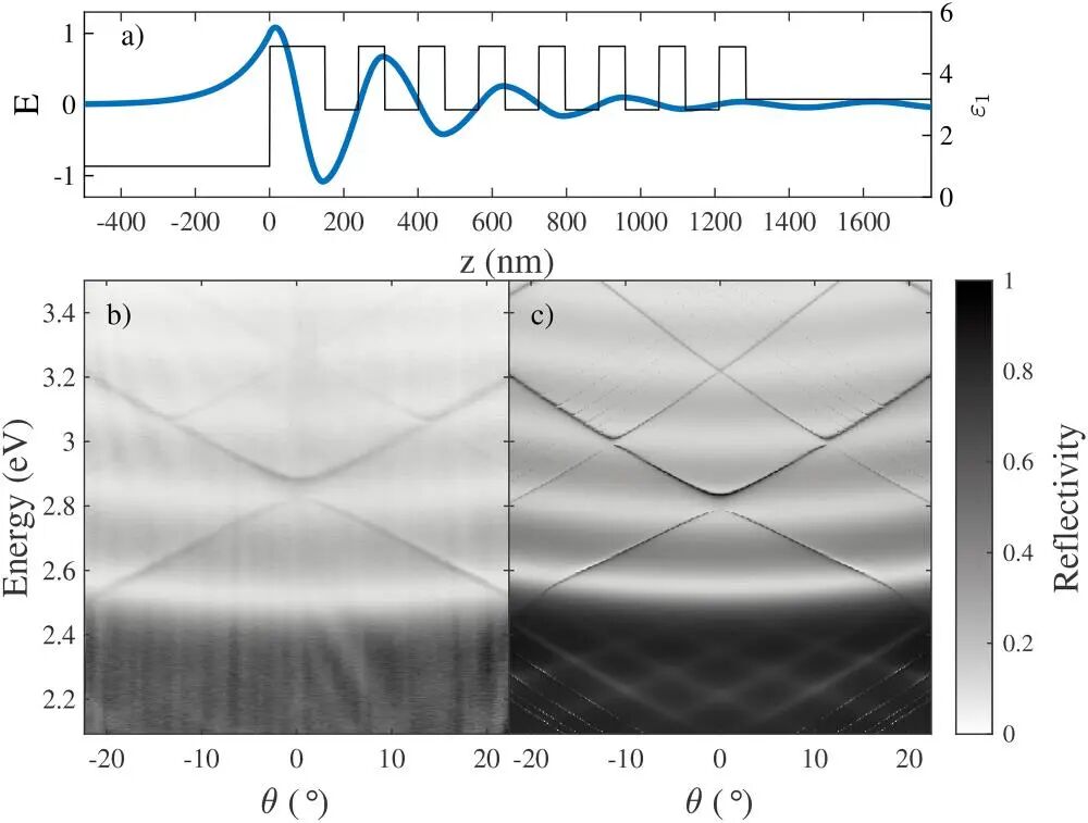 (a) BSW的指數(shù)衰減場分布疊加在樣品介電函數(shù)分布圖上(固定能量下);(b) 和 (c) 分別展示了周期 L = 400 nm、高度 h = 30 nm 的光柵區(qū)域的測量和模擬反射率映射圖。高反射率的窄色散線對應于不同衍射級次 m 的準布洛赫表面波模式
