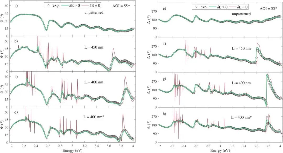 成像光譜橢偏儀:在2–4 eV光譜范圍、45°和55°入射角下,測量光柵區(qū)域的Ψ和Δ光譜。測量考慮了儀器的有限光譜帶寬(δE)和空間分辨率(~1 μm)。