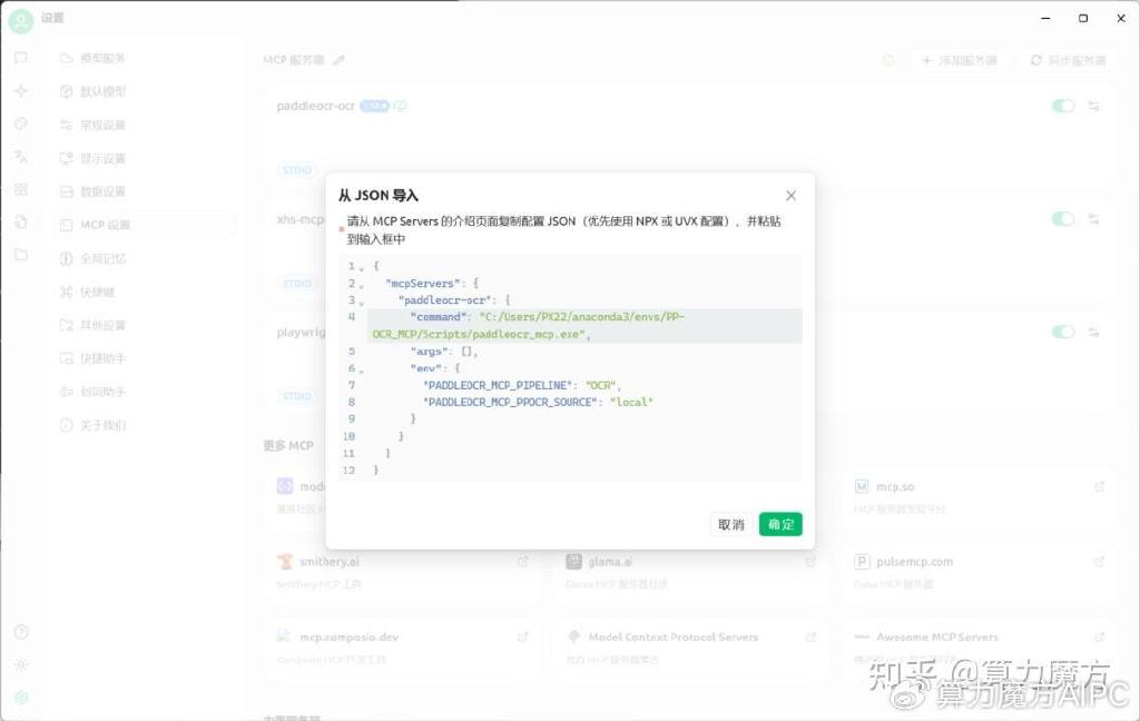 {"mcpServers": {"paddleocr-ocr": {"command": "請注意,如果你使用的是Anaconda,請在Anaconda安裝的隔離環(huán)境中輸入where paddleocr_mcp來獲取對應的MCP路徑。否則無法使用",