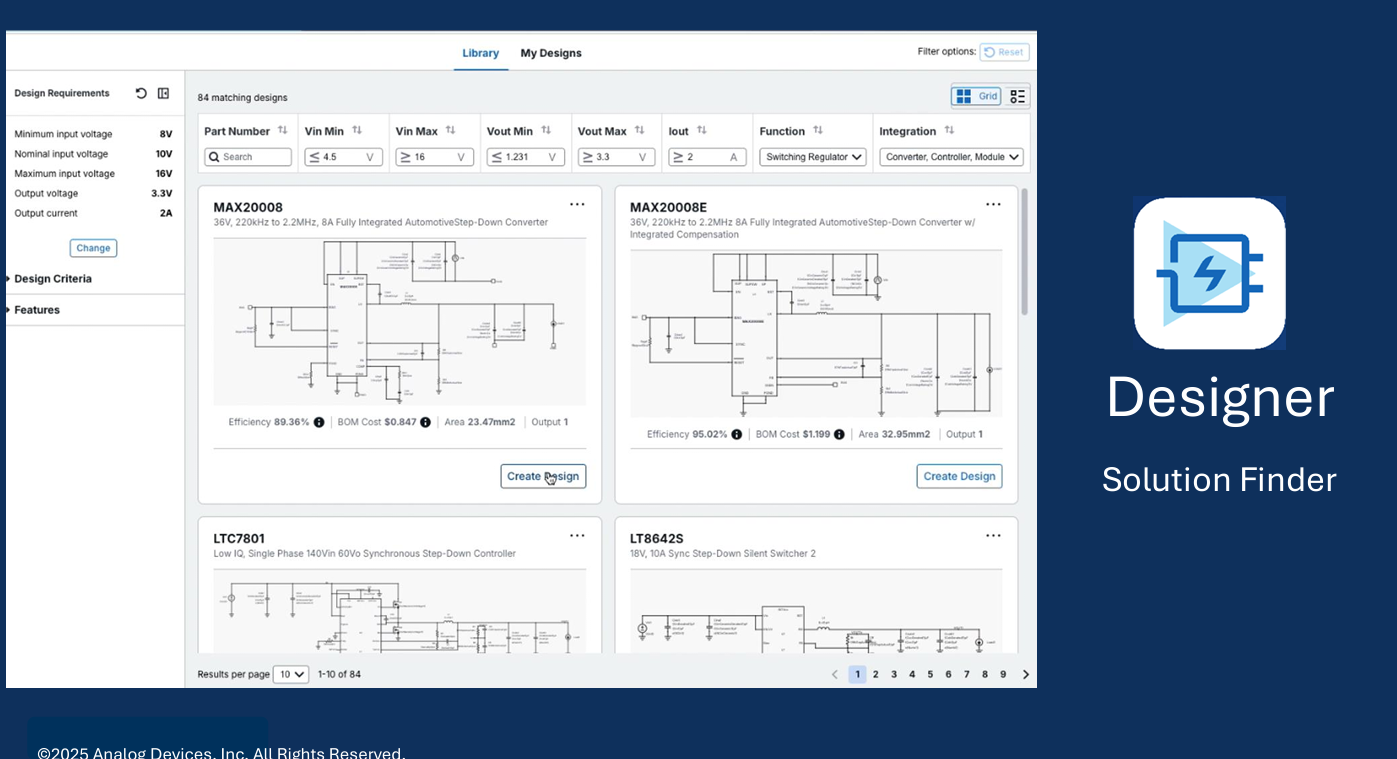 而新發(fā)布的ADI Power Studio Designer,是一款面向集成電路(IC)級(jí)電源設(shè)計(jì)的網(wǎng)頁(yè)端工具。它基于ADI備受信賴的電源設(shè)計(jì)架構(gòu)開發(fā),提供引導(dǎo)式工作流程,可輸出經(jīng)過(guò)優(yōu)化的元件推薦、性能估算和量身定制的效率分析。借助這款工具,工程師能夠更有把握地推進(jìn)設(shè)計(jì)方案的仿真、配置與評(píng)估工作。此外,Designer支持的器件類型與產(chǎn)品來(lái)源無(wú)關(guān)。