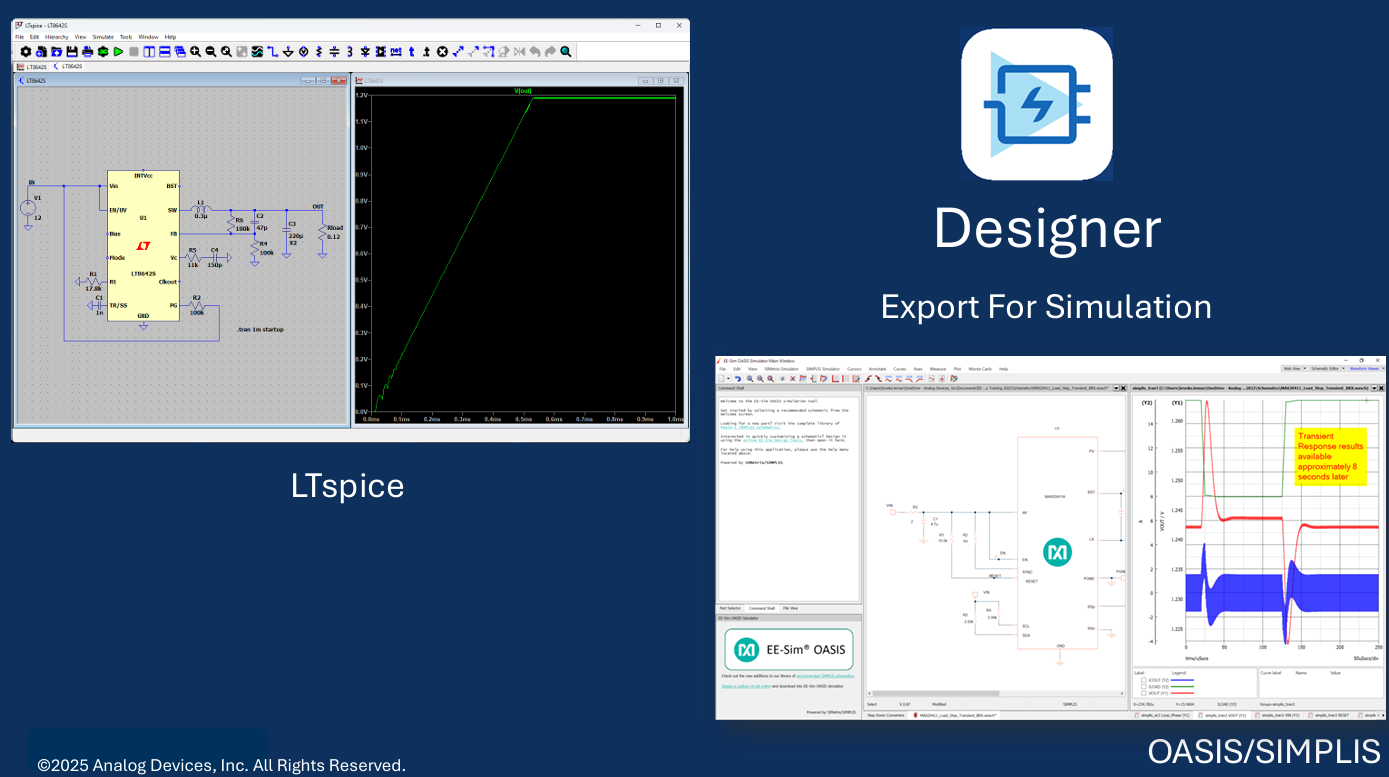 仿真階段,Power Studio整合了LTspice與SIMPLIS兩款仿真引擎,可在硬件落地實(shí)施前對(duì)設(shè)計(jì)方案進(jìn)行驗(yàn)證。其中,LTspice主要適用于原凌力爾特的器件,SIMPLIS則支持原美信的器件。二者相輔相成,在Power Studio生態(tài)系統(tǒng)內(nèi)提供基于模型的精準(zhǔn)仿真能力。