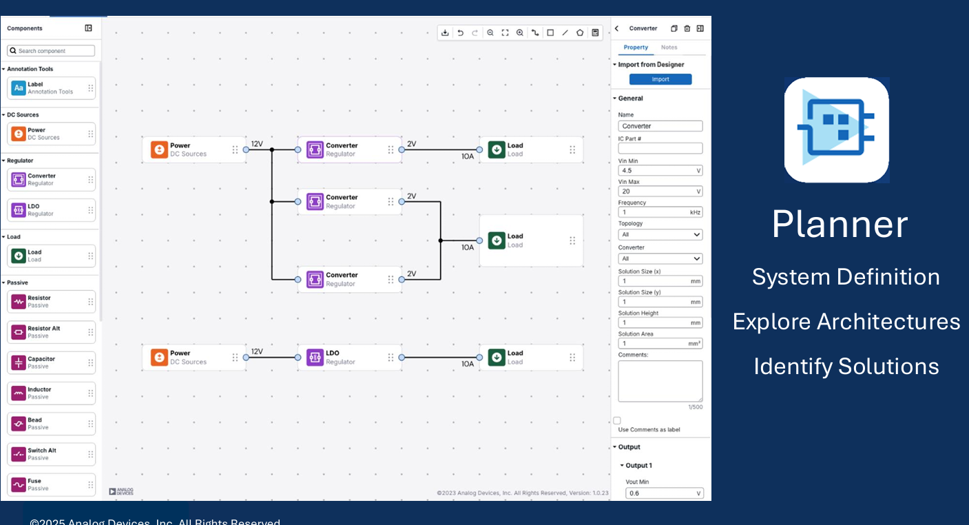 而此次新發(fā)布的ADI Power Studio Planner,是一款面向系統(tǒng)級(jí)電源樹規(guī)劃的新一代網(wǎng)頁(yè)端工具。它為工程師提供交互式系統(tǒng)架構(gòu)視圖,支持直觀簡(jiǎn)明的建模、功耗計(jì)算及效率分析。憑借參數(shù)搜索、權(quán)衡比較等功能,Planner可助力工程師團(tuán)隊(duì)在設(shè)計(jì)流程早期階段做出更優(yōu)的架構(gòu)決策。