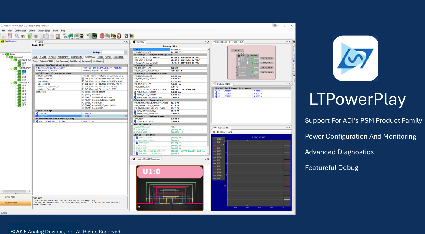 配置階段,LTpowerPlay是一款PC端軟件工具,用于對(duì)ADI的數(shù)字電源系統(tǒng)管理IC進(jìn)行配置、監(jiān)測(cè)與調(diào)試。它具備實(shí)時(shí)遙測(cè)、故障記錄及腳本編寫功能,能夠適配實(shí)驗(yàn)室與生產(chǎn)環(huán)境的不同使用需求。