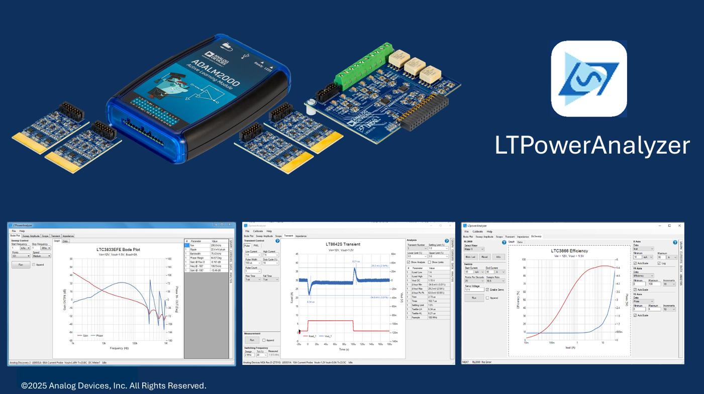 在測(cè)試階段,LTpowerAnalyzer是一款操作便捷的PC端應(yīng)用程序,用于電源設(shè)計(jì)方案的評(píng)估與特性分析。它支持波特圖、瞬態(tài)響應(yīng)、輸出阻抗等多項(xiàng)測(cè)量功能,且能與EVAL-LTPA-KIT硬件實(shí)現(xiàn)無(wú)縫協(xié)作。