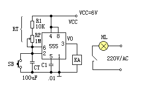 按一下按鈕開關(guān)SB之后,定時(shí)電容CT立即放到電壓為零。于是此時(shí)555電路等效觸發(fā)的輸入成為:R=0、S=0,它的輸出就成高電平:V0=1。繼電器 KA吸動(dòng),常開接點(diǎn)閉合,曝光照明燈點(diǎn)亮。按鈕開關(guān)按一下后立即放開,于是電源電壓就通過RT向電容CT充電,暫穩(wěn)態(tài)開始。當(dāng)電容CT上的電壓升到 2/3VCC既4伏時(shí),定時(shí)時(shí)間已到,555等效電路觸發(fā)器的輸入為:R=1、S=1,于是輸出又翻轉(zhuǎn)成低電平:V0=0。繼電器KA釋放,曝光燈HL熄滅。暫穩(wěn)態(tài)結(jié)束,有恢復(fù)到穩(wěn)態(tài)。