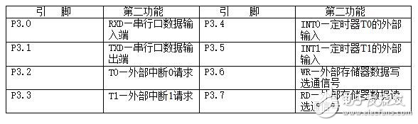 P3口(p3.0—p3.7):其為雙功能口,作為第一功能使用時(shí),其功能與P1口相同。當(dāng)作為第二功能使用時(shí),每一位功能如下表所示。