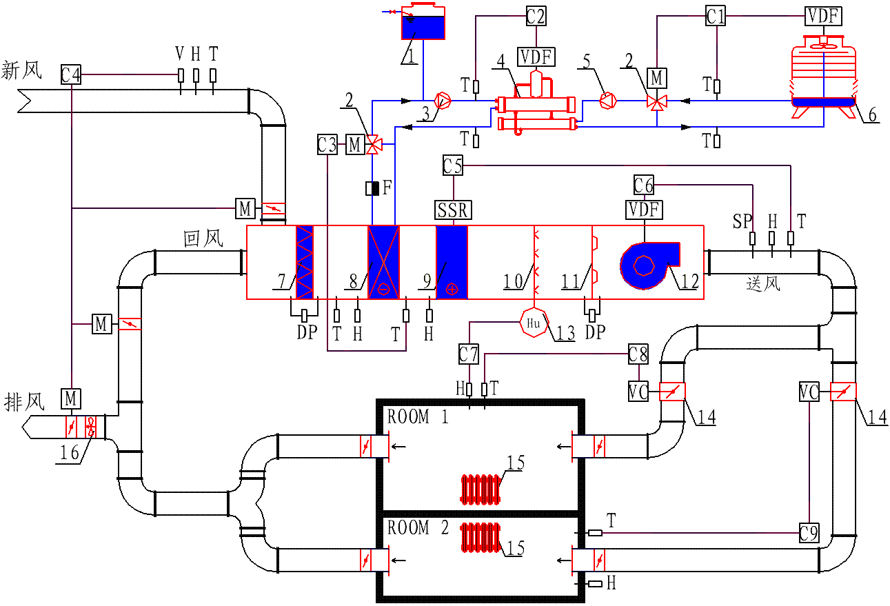 ● 風(fēng)系統(tǒng)包括:組合式空調(diào)箱、送風(fēng)管道、回風(fēng)管道、排風(fēng)管道、VAVBOX以及閥門(mén)和其他控制元件。空調(diào)箱包括新回風(fēng)混合段、過(guò)濾器、表冷器、電加熱器、送風(fēng)風(fēng)機(jī)、蒸汽加濕器等。風(fēng)機(jī)變頻控制。新回風(fēng)管上分別裝有電動(dòng)調(diào)節(jié)閥,可調(diào)節(jié)新回風(fēng)比例,表冷器前后分別裝有溫濕度測(cè)點(diǎn),空調(diào)箱內(nèi)還裝有噴嘴,用于空氣流量的測(cè)量。