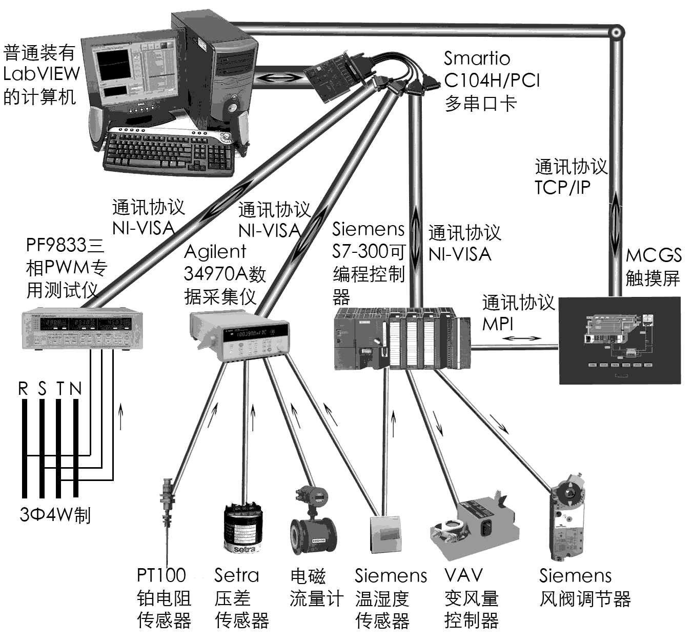 控制元件進(jìn)行準(zhǔn)確測(cè)量及時(shí)控制的數(shù)據(jù)采集控制系統(tǒng)。使用NI公司的LabVIEW Developer Suite,把HVAC系統(tǒng)中各種不同設(shè)備統(tǒng)一起來(lái),進(jìn)行集中采集控制。建立一套基于PC的HVAC數(shù)據(jù)采集控制系統(tǒng)。